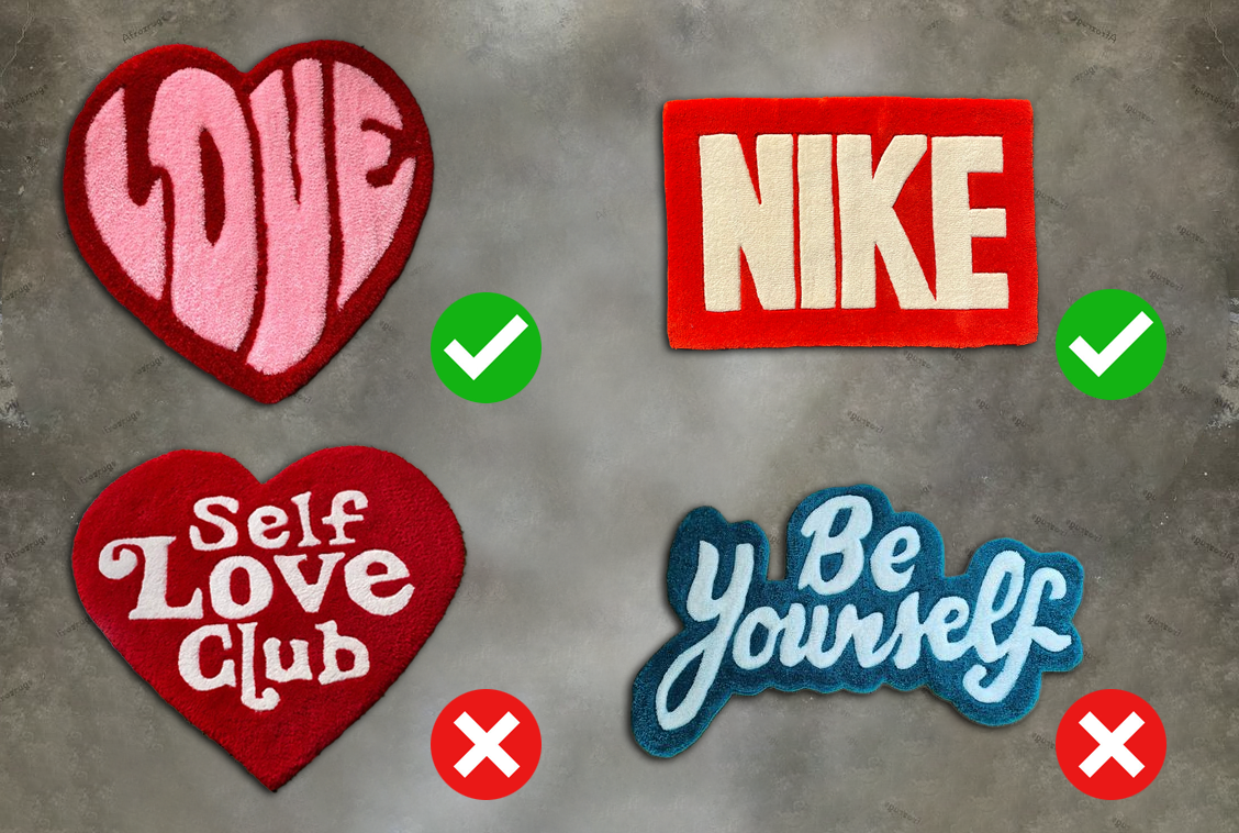 Si tu souhaites réaliser un motif avec un texte/typographique, il faudra se contenter de mots de 4 lettres. Les textes sont complexes à réaliser lorsque l'on commence et les format 30x30cm et 40x50cm ne s'y prête pas vraiment. Voici une image pour illustrer les motifs typographique qui sont/ne sont pas réalisables: